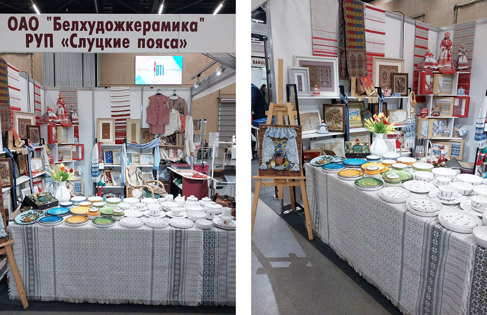 На объединенном стенде ОАО «Белхудожкерамика» и РУП «Слуцкие пояса» представлен широкий ассортимент выпускаемой продукции, демонстрирующий богатство национальных традиций и высочайшее качество.