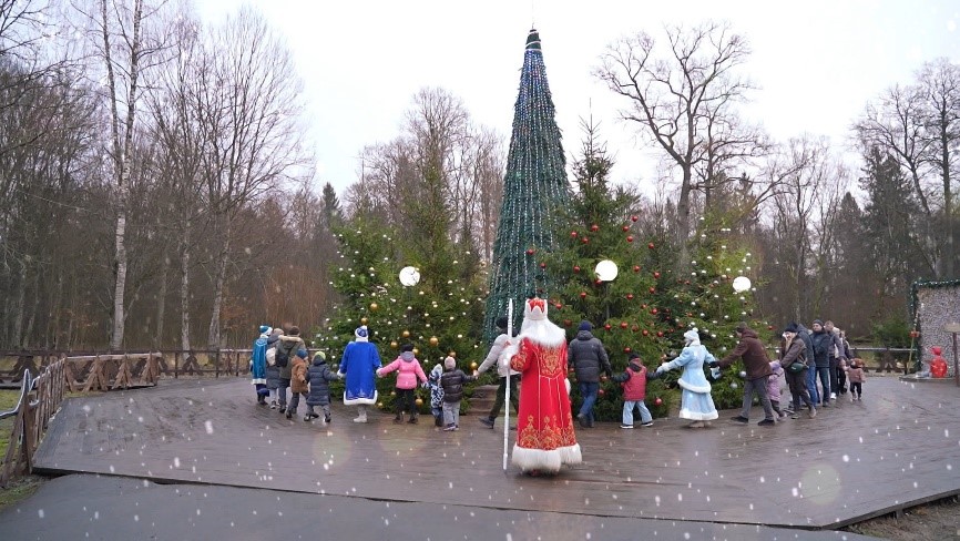 Сейчас наступил зимний сезон, гостей в поместье каждый день очень много. Встречает Дед Мороз своих гостей возле новогодней елки, ведь это главный новогодний символ.