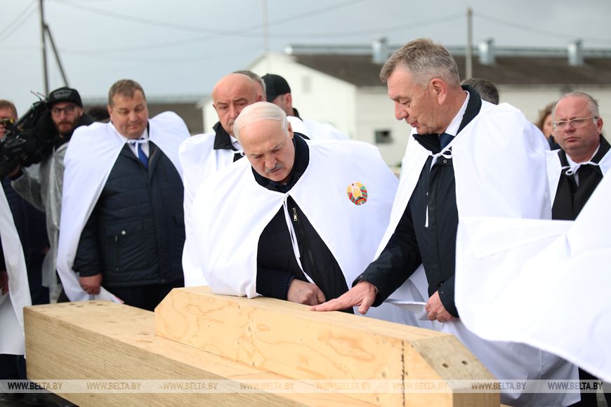 Кроме того, здесь также ввели в строй молочно-товарный комплекс из деревянных конструкций, произведенных из местного сырья. Главе государства показали новые помещения, где содержат молодняк и основное стадо. Президент в целом положительно отозвался о проведенных работах: "Хорошие помещения. И объемы хорошие, и проветриваются".