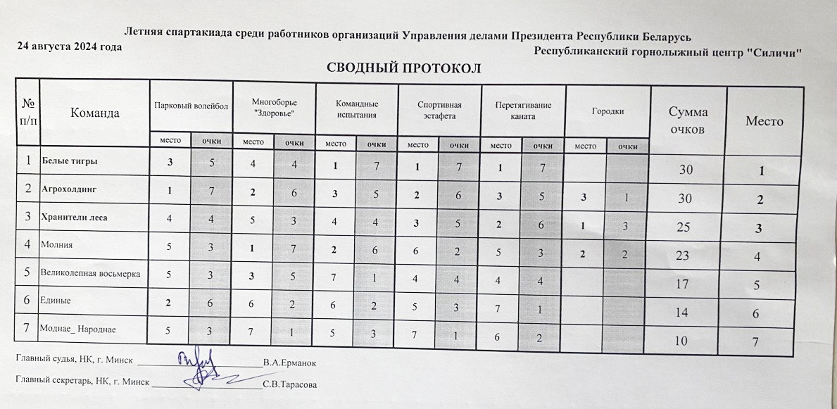 Победу во второй летней спартакиаде среди работников организаций Управления делами Президента одержала команда «Белые тигры», объединившая в своем составе работников организаций здравоохранения, оздоровления и отдыха: санаториев «Юность», «Приозерный», «Сосны» и «Боровое», Республиканского клинического медицинского центра, Комплекса по оказанию услуг имени Машерова, Центра гигиены и эпидемиологии и «БелЛекоЦентра».