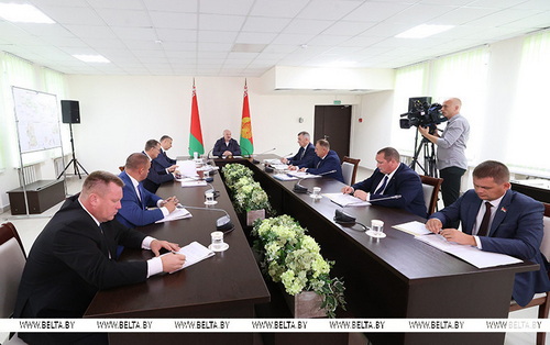 Александр Лукашенко после совещания в агрогородке Городище по перспективам развития холдинга "Купаловское" и общения с местными жителями приехал на машинный двор предприятия. Здесь состоялся разговор об обеспечении ремонта и сохранности техники, поддержании производственной дисциплины.
