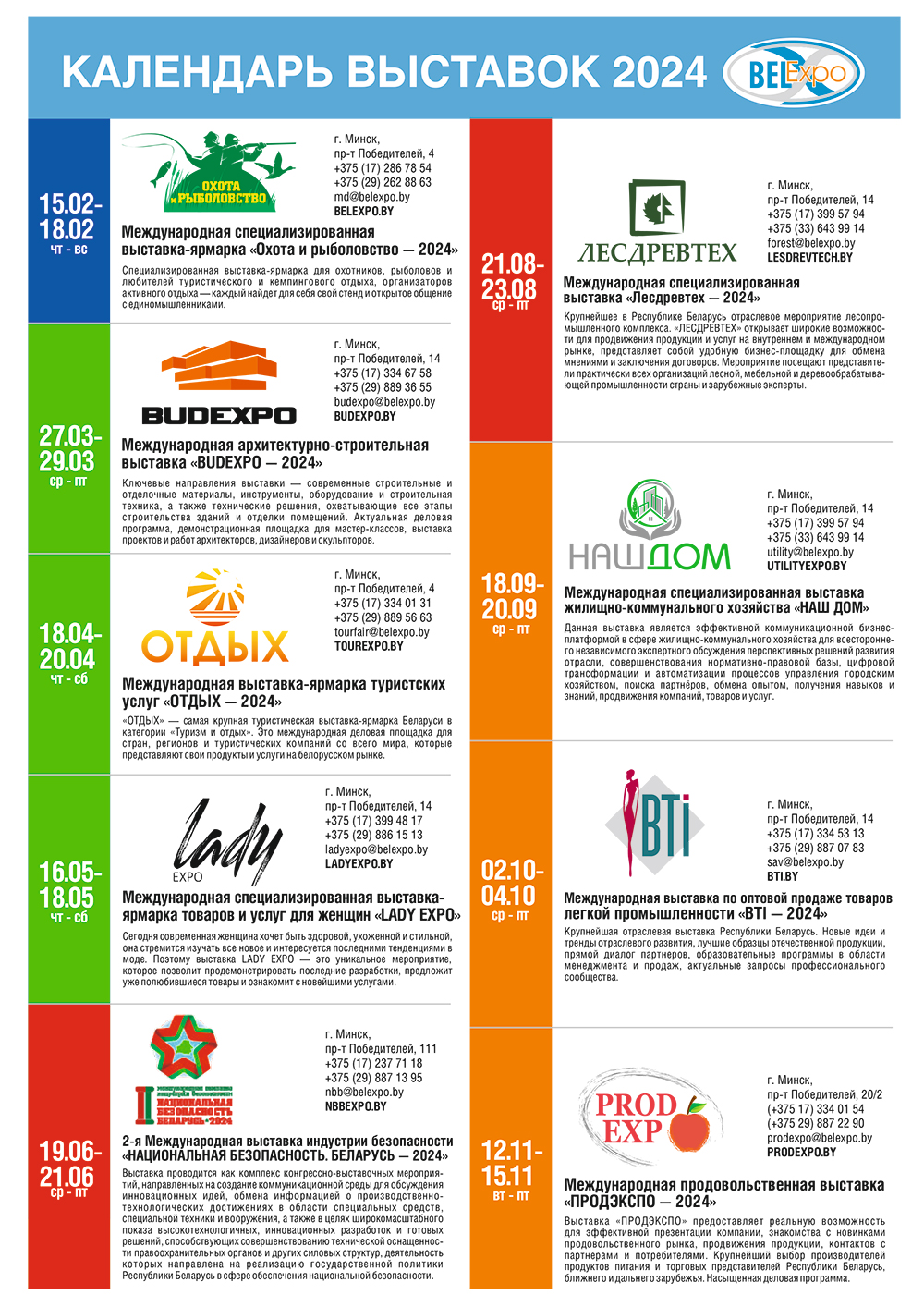Выставочный центр «БелЭкспо» сформировал календарь международных специализированных выставок, проводимых предприятием в 2024 году.